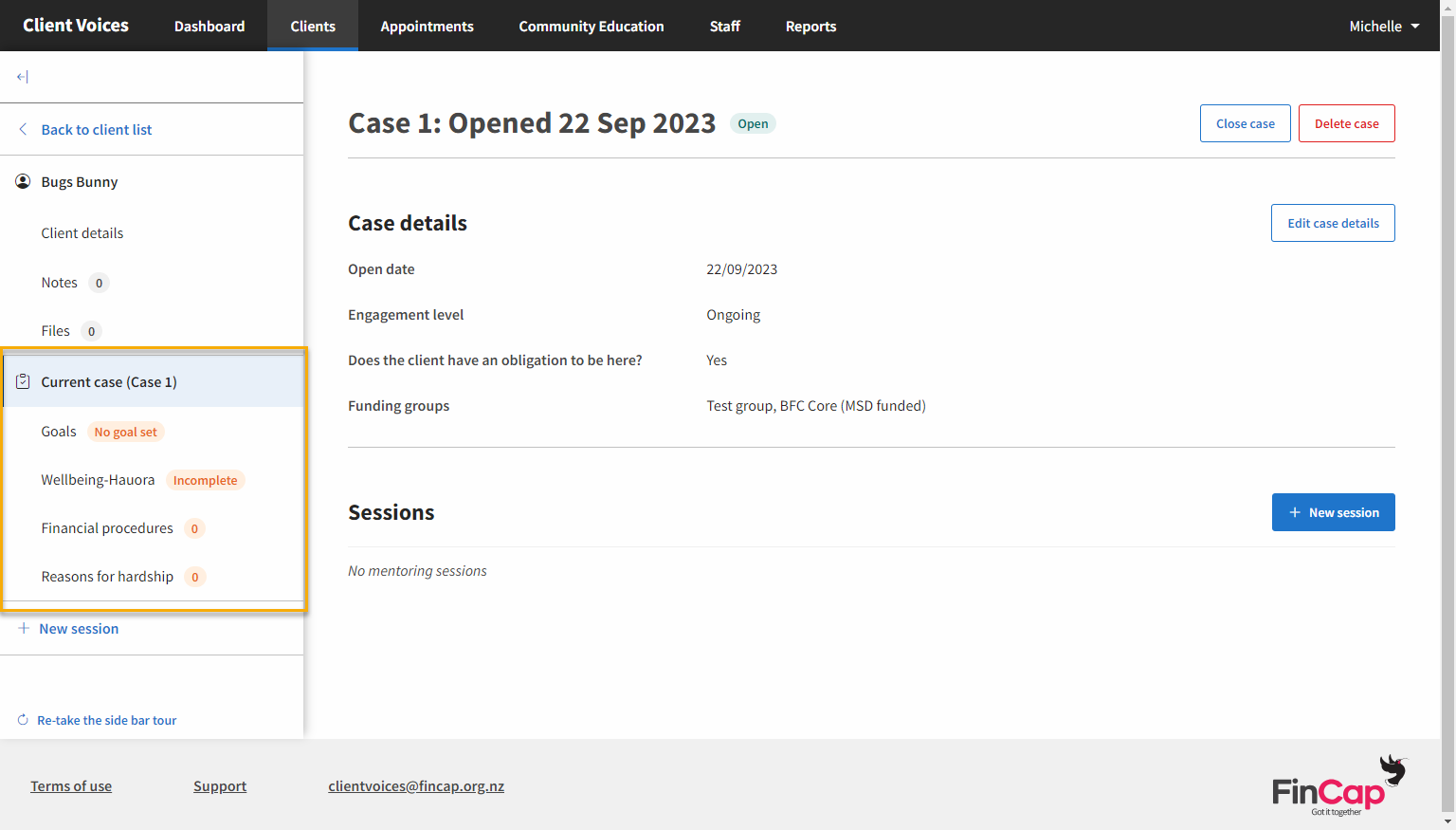 Now that the client case has been created, a new section appears in your side-navigation and you can now start creating sessions.