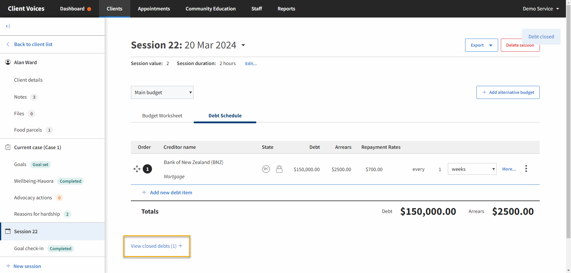 Closing a debt will remove the debt from your debt schedule and budget worksheet while retaining the information for your reports. This action is also reversible.